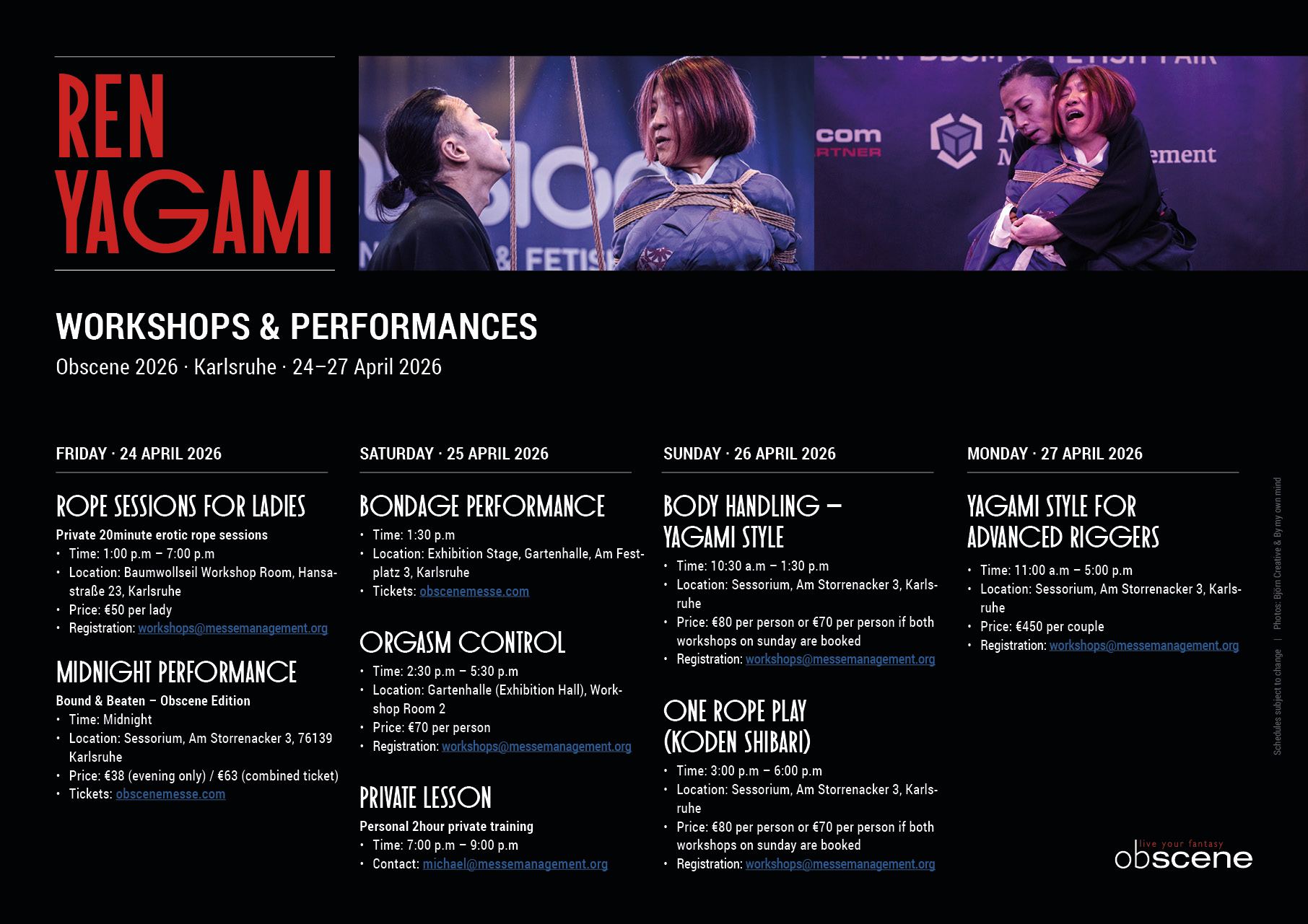 At obscene 2026, you can experience Ren Yagami in stage shows, benefit from his brilliant knowledge in workshops, and have the rare opportunity to book private lessons or rope sessions with him.